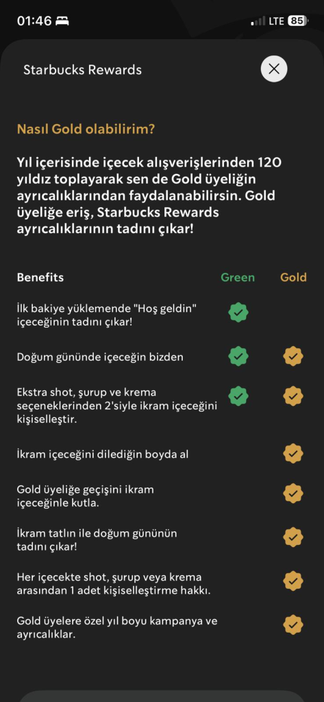 Öncelikle onboarding olarak herkes “Green Level – Yeşil Seviye” oluyor ve yıldız toplayabilse de “Gold Level – Altın Seviye” olunca hem girişte “ücretsiz kahven” hem de yaşgünleri ve özel günlerdeki ikramlardan ve daha fazla yıldız toplama şansını bulamıyorsun. 120 yıldız toplayarak hemen “Altın Seviye” geçebilirsin.