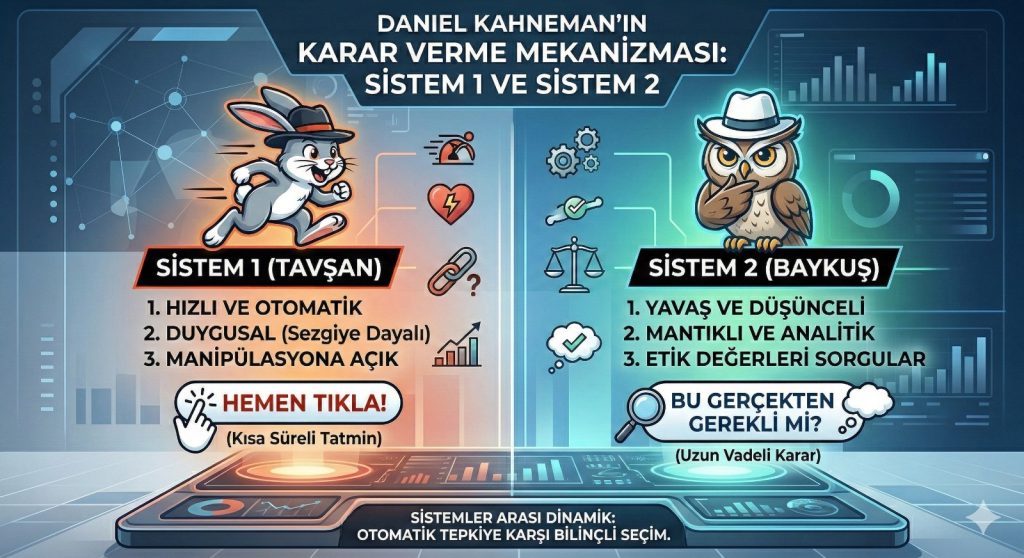 duygusal ve sezgiseldir; Sistem 2 ise yavaş, mantıklı ve hesapçıdır. Manipülatif tasarımlar