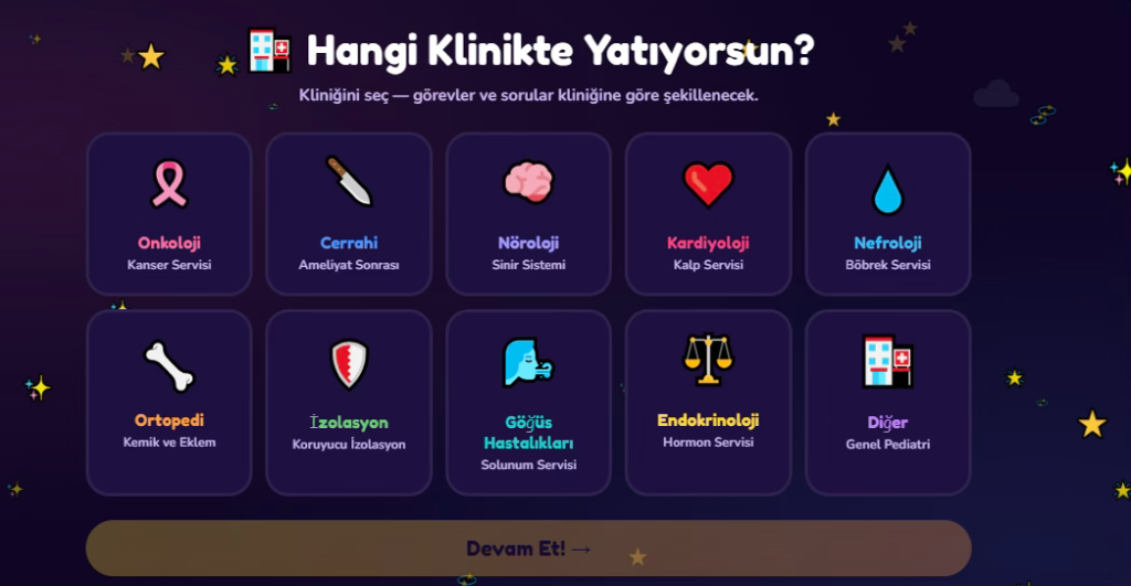-Onboarding (Tanışma): Hastaneye kabulün ilk saatinde çocuk kendi karakterini (Dedektif, Maceracı vb.) seçer ve “Kahraman Kiti”ni alır. Bu aşamada kurallar basittir: “İlacını iç, ilk rozetini kap.”