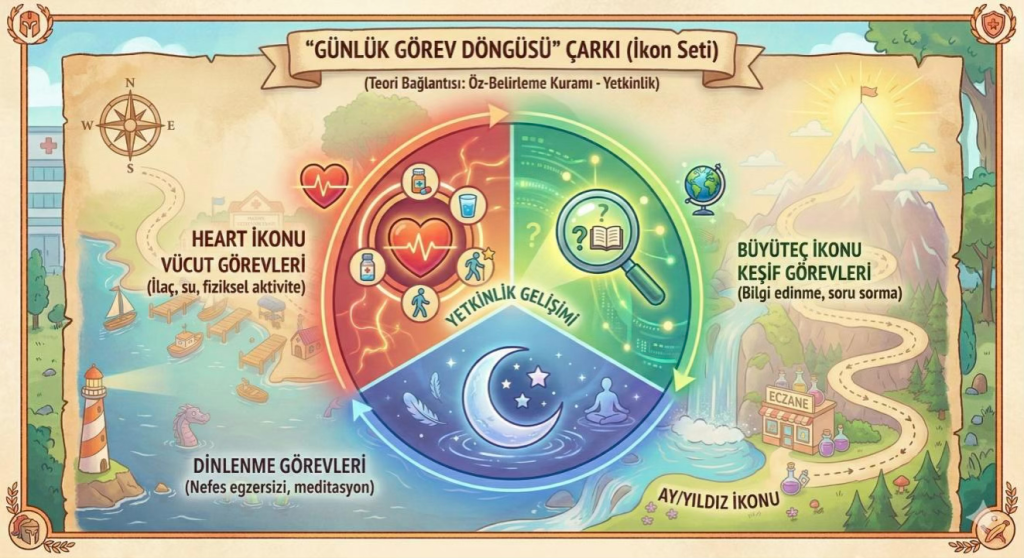 -Habit Building (Alışkanlık): Tedavi rutine biner. Günlük görev döngüsü (Vücut, Keşif, Dinlenme görevleri) sayesinde ilaç almak ve semptom bildirmek artık zorunluluk değil, puan kazandıran birer “challenge”dır.