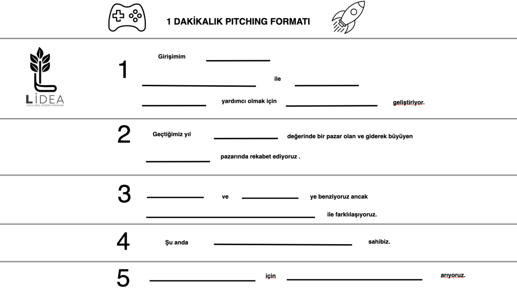 Lidea Girişimcilik programının ön kuluçka kısmındaki eğitimlerden birisi de fikrini sunarken 1 cümlede sunabilme yeteneği kazandırmaktır. Amerika’da “asansör sunumları-elevator pitch” olarak ta bilinen bu yaklaşımda fikrinizin karşı tarafa en kısa sürede probleminiz ona çözümünüz ile farkınız ve beklentinizi koyduğunuz bir formattan oluşur.