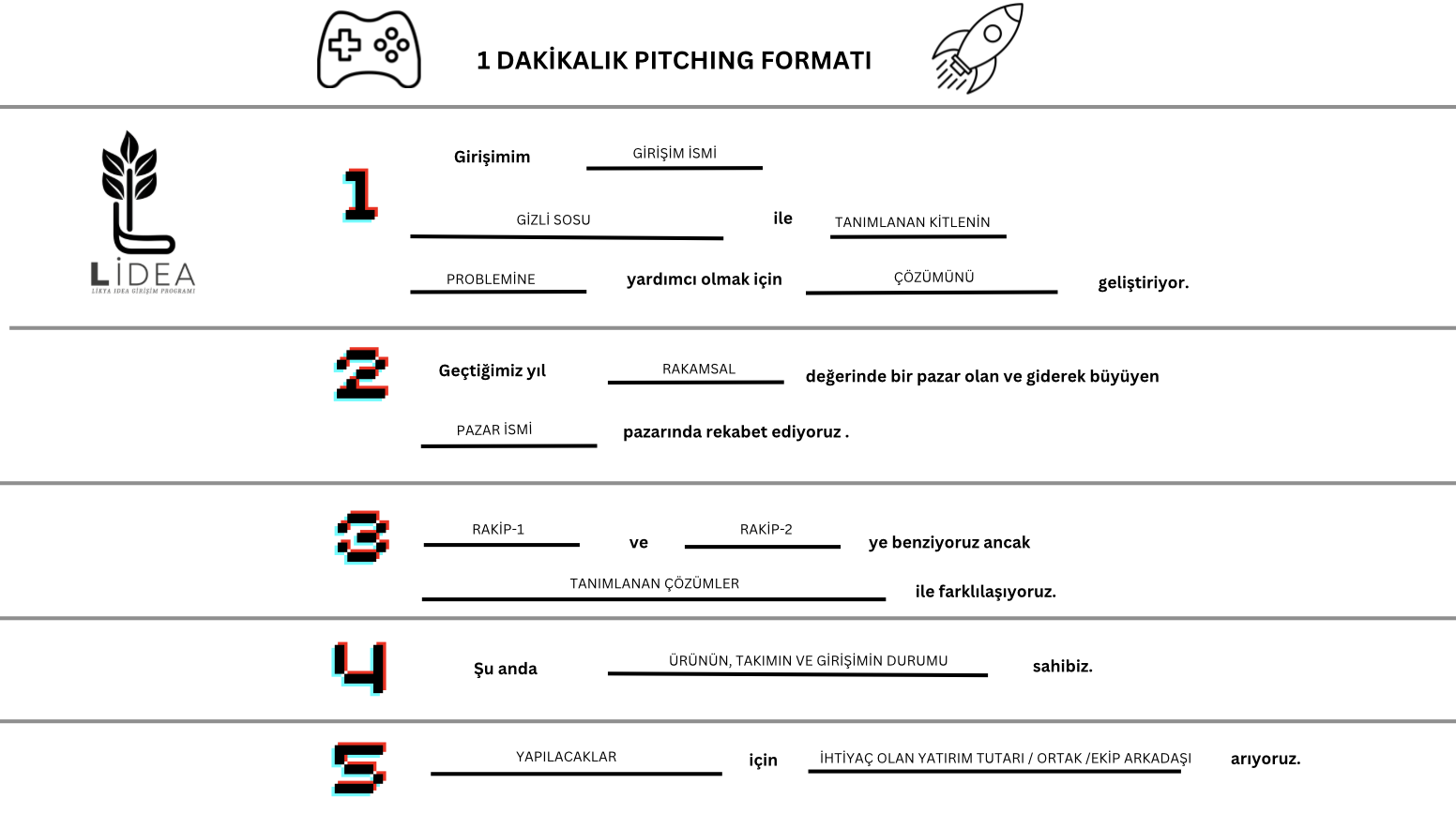 Lidea Girişimcilik programının ön kuluçka kısmındaki eğitimlerden birisi de fikrini sunarken 1 cümlede sunabilme yeteneği kazandırmaktır. Amerika’da “asansör sunumları-elevator pitch” olarak ta bilinen bu yaklaşımda fikrinizin karşı tarafa en kısa sürede probleminiz ona çözümünüz ile farkınız ve beklentinizi koyduğunuz bir formattan oluşur.